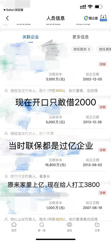 这群老板,以前身价都是多少亿,现在他躲在外地不敢回来(家里债主太多)他们以前开口都是上百万,现在开口借钱就敢说2000(我以前在他公司短期上过班实习,以前他风光时候,他走路,边上都几个人围着他报告)